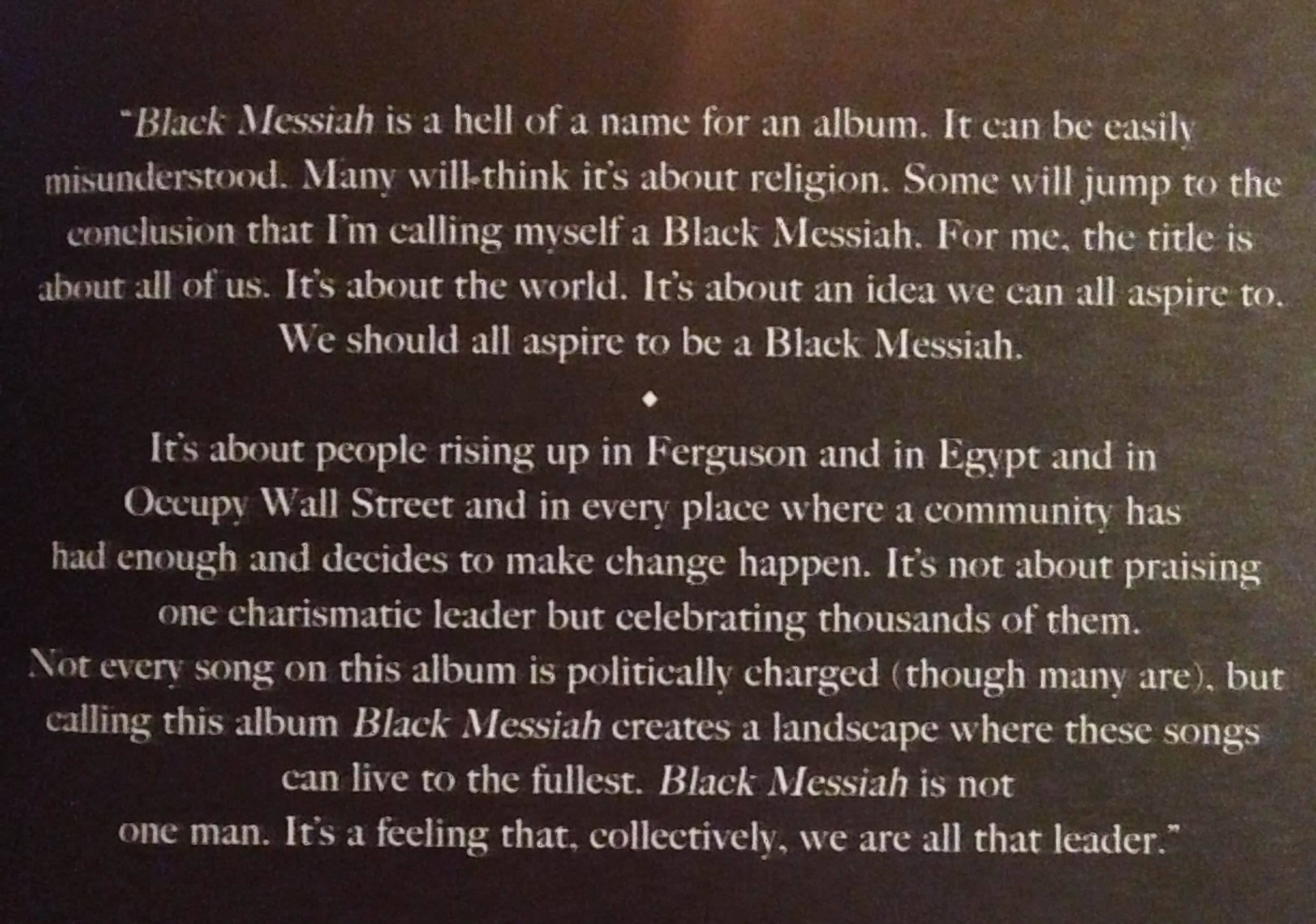 Ce 15 Décembre 2014 fut l’avènement d’un très grand album de Nusoul, ou de Soul simplement. Black Messiah de D’Angelo. Inutile de le nier. Tous les doutes et appréhensions se sont estompés au fil d’écoutes prolongées. Notons que quelques-unes des douze chansons ont été interprétés en live pour son grand retour en 2012 (« The Charade« , « Sugah Daddy« ), des vidéos amateurs des chanceux qui ont pu le voir sur scène en attestent. Une en particulier, « 1000 Deaths » a été enregistré en 2010 quand l’album devait encore s’appeler James River. Bref, tout s’évapore, rien n’a plus d’importance que ce bon Dieu d’album. Hop, assez tourné autour du pot, go: « Ain’t That Easy« . Claque magistrale, et pas que ces caisses qui nous giflent les tympans. Voodoo ne paraît plus si lointain, comme si un trou de ver a relié ces deux albums. « Shut your mouth and focus on what you feel inside » nous assène-t-il dans un grondement de guitare électrique. Même pas la peine de nous le dire mais message reçu 5/5 ! Que c’est bon, que ça fait du bien ! Sacrés musiciens cette bande de Vanguard, ils vont nous en mettre plein les oreilles tout du long. On hésite à mettre ce premier titre sur ‘repeat’ mais la tentation de découvrir les autres chansons est bien trop grande.